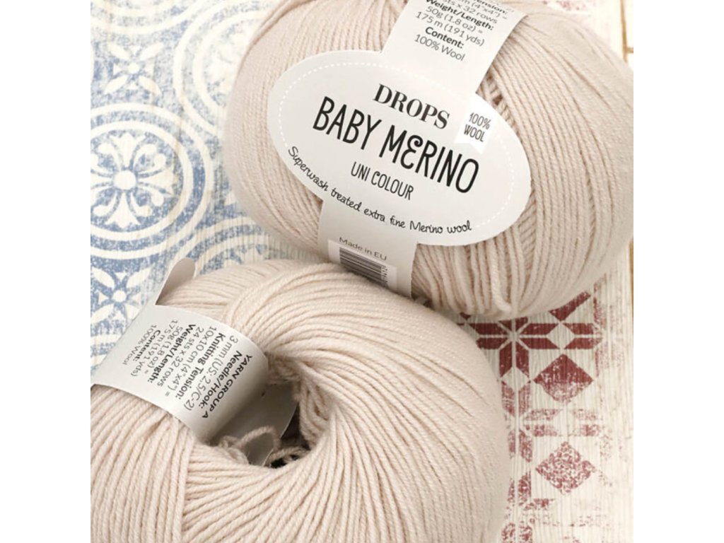 DROPS Baby Merino je skána z jemných vláken 100% merino vlny, která je extra jemná, prodyšná a nedráždivá - ideální pro citlivou pokožku miminek a malých dětí. Vlákno příze pěkně vykresluje oka i vzorky, a výsledkem je úhledný, velmi pružný úplet. Výjimečná pružnost příze klade zvláštní nároky na správné zpracování úpletu: dbáme na to, abychom dodrželi hustotu zkušebního vzorku - raději volíme hustší (tj. pleteme na tenčích jehlicích), než volnější.