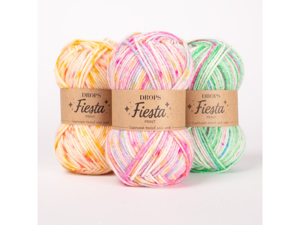 Varianty příze DROPS Fiesta s pestrobarevným potiskem imitují ruční barvení a mají proto i drobné odchylky ve vzorování a odstínech - díky tomu nebudou žádná dvě přadena vypadat přesně stejně. Tyto odchylky nejsou vadou, ale charakteristickým znakem takové techniky barvení.