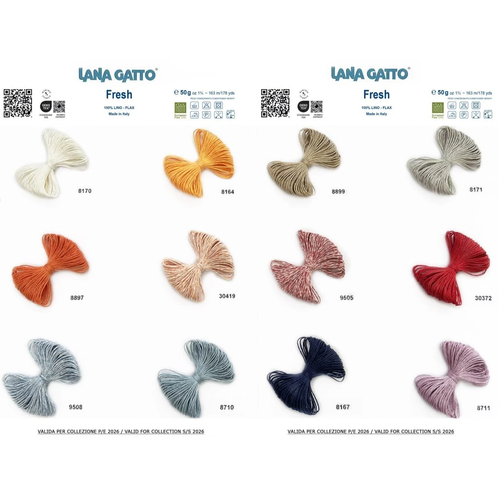 Lana Gatto Fresh je příjemná příze ze 100% lnu, která je ideální pro lehké a vzdušné letní projekty. Len je známý svou pevností, prodyšností a schopností dobře odvádět vlhkost, takže úplety z něj působí svěže a jsou velmi příjemné na nošení i v teplejším počasí.