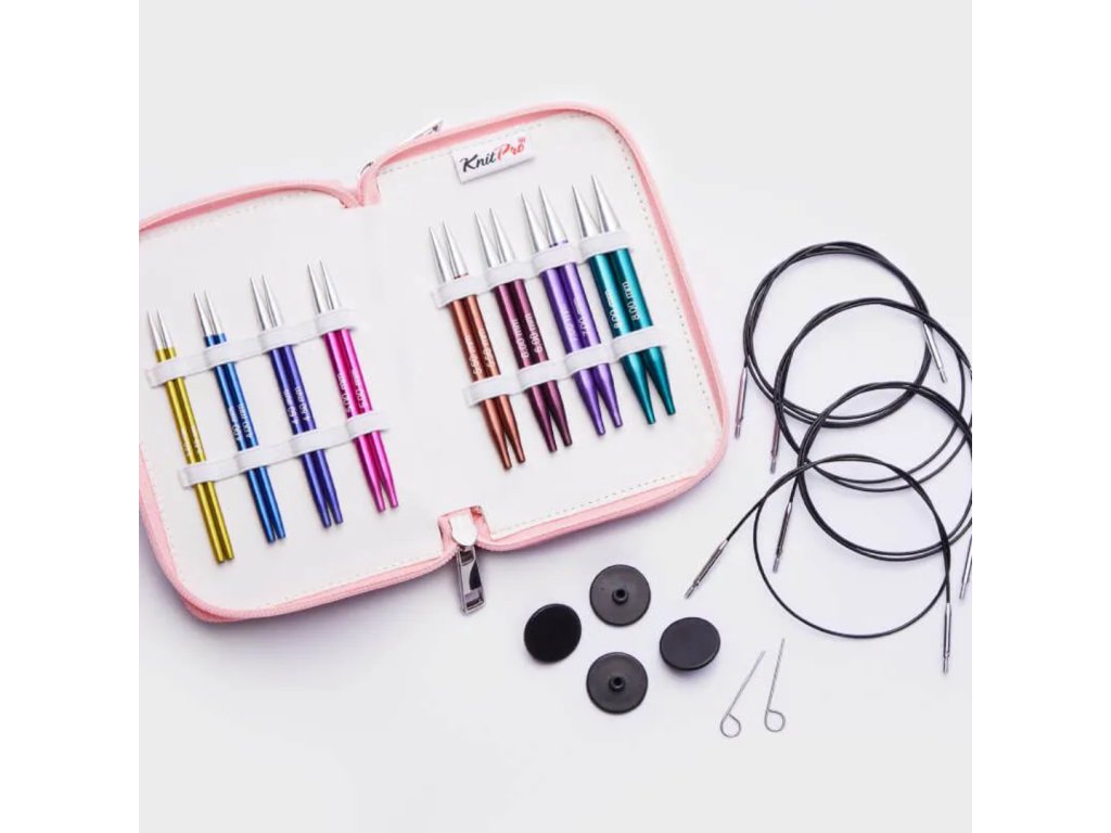 Tato luxusní sada KnitPro Zing nabízí 8 párů vyměnitelných kruhových jehlic spolu se všemi potřebnými doplňky pro snadnou výměnu a pohodlné pletení. Součástí balení jsou také čtyři 360° otočná lanka v různých délkách, která umožňují plynulý pohyb při práci bez kroucení.