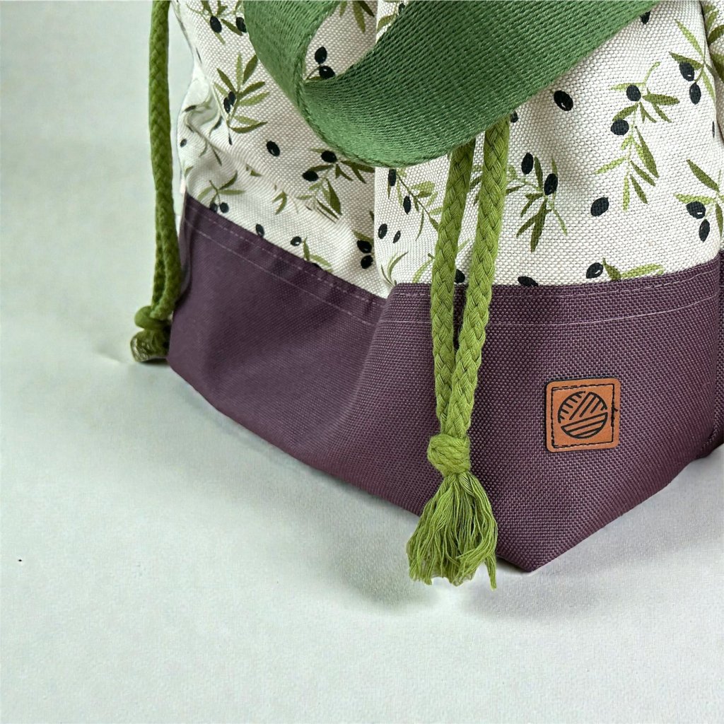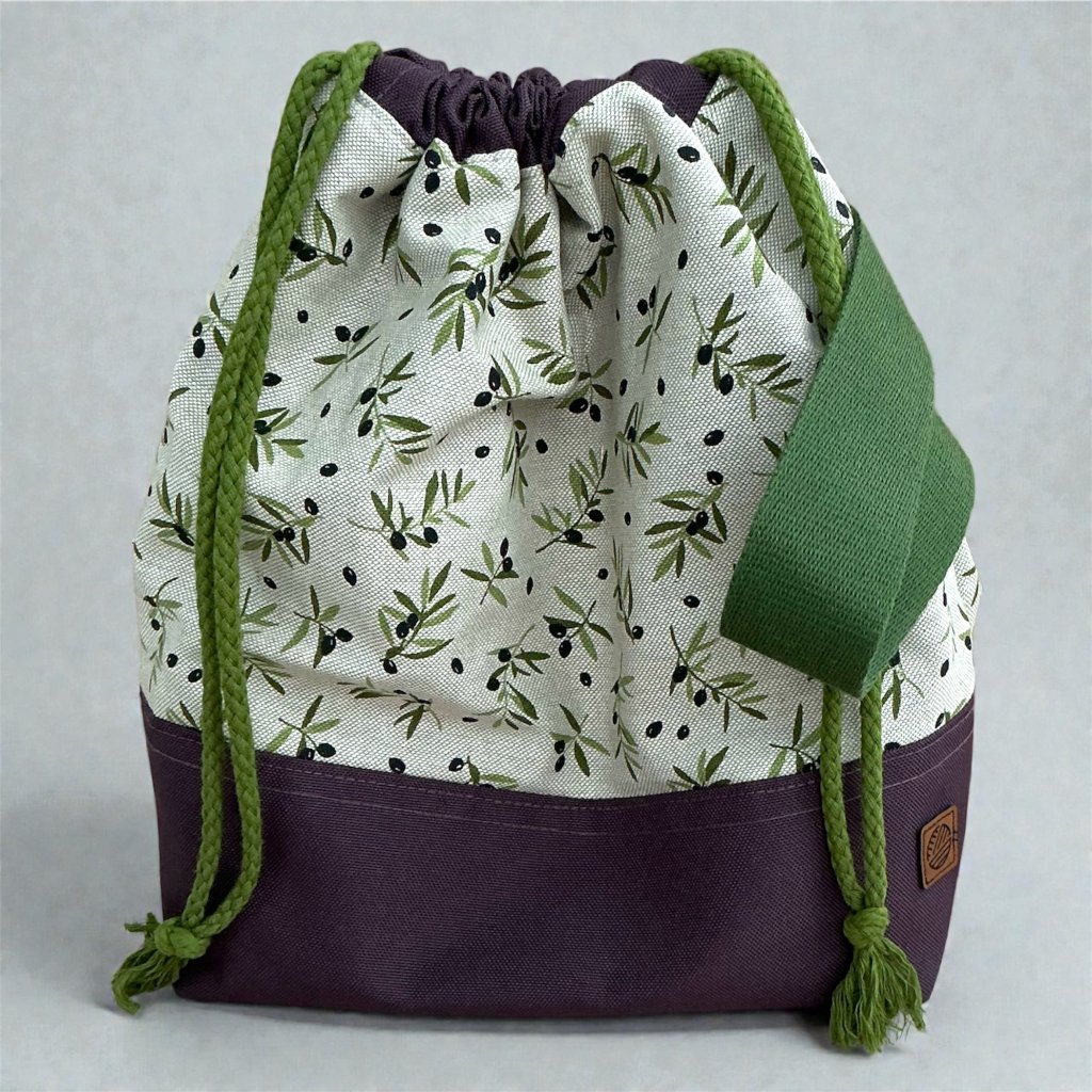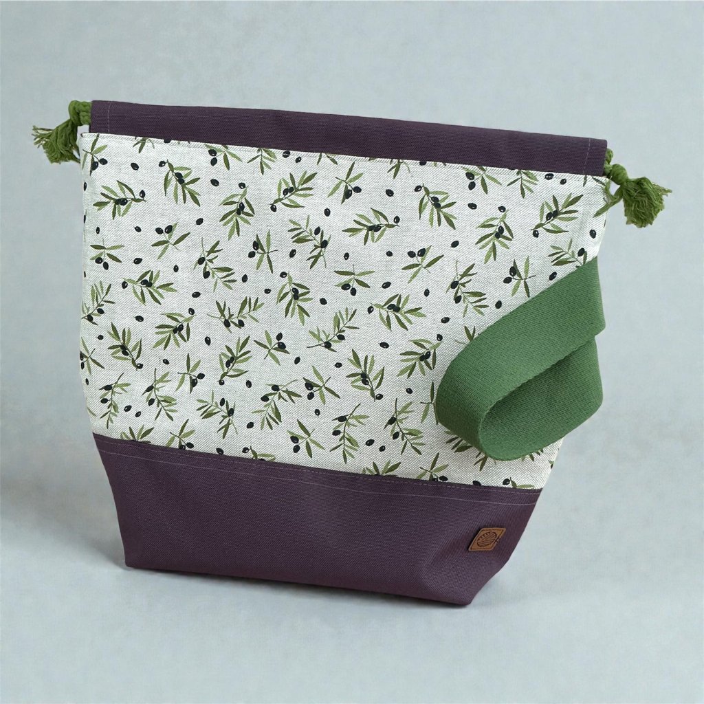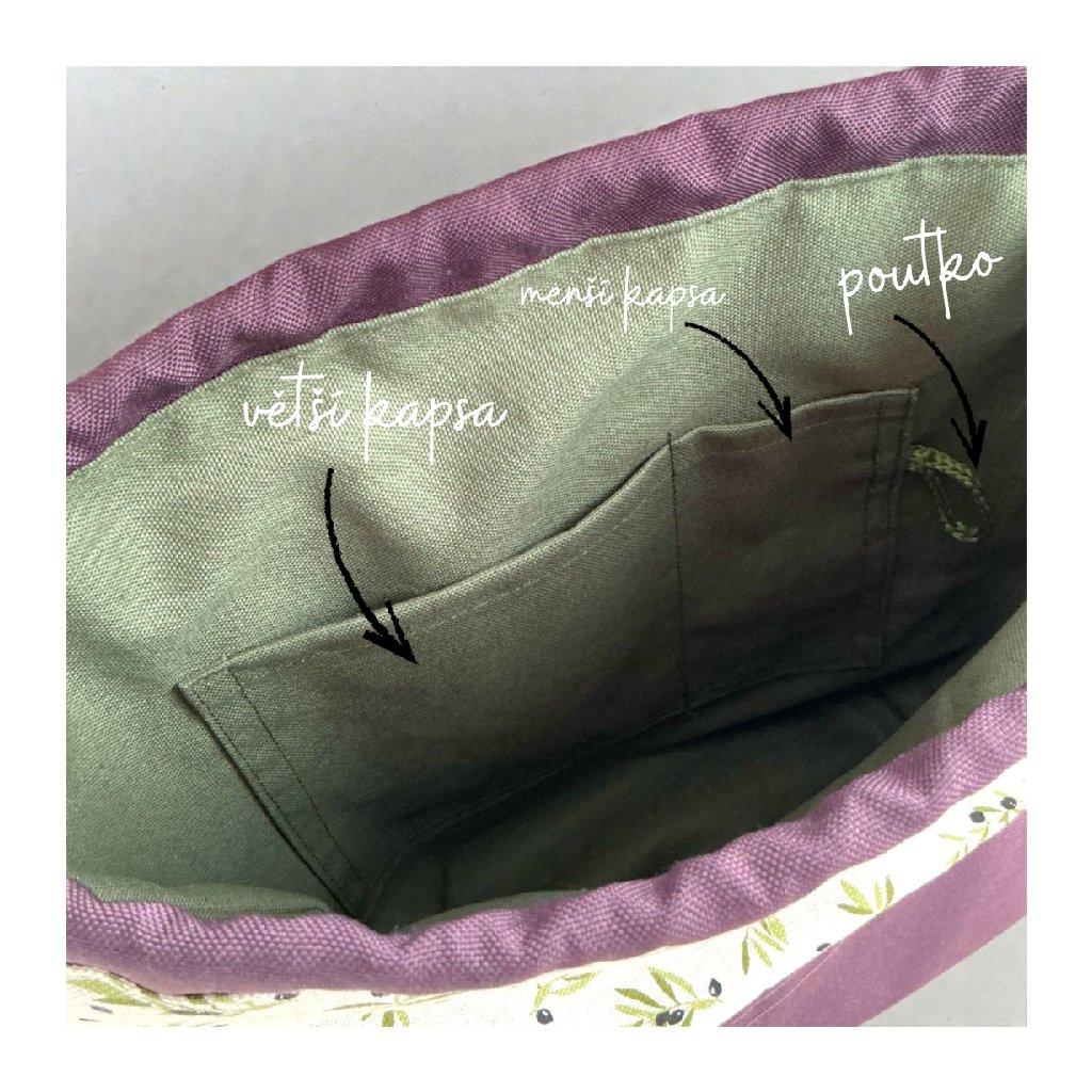 Ručně šitá projektová taška Klubkovka, vyrobená v malebném kraji Podhostýnska s bavlněnou podšívkou, dvěma kapsami, poutkem na značkovače, širokým popruhem na zápěstí a odolným dnem z omyvatelné kočárkoviny. Stahování bavlněnou šňůrkou — ideální na cesty i domácí pletení.