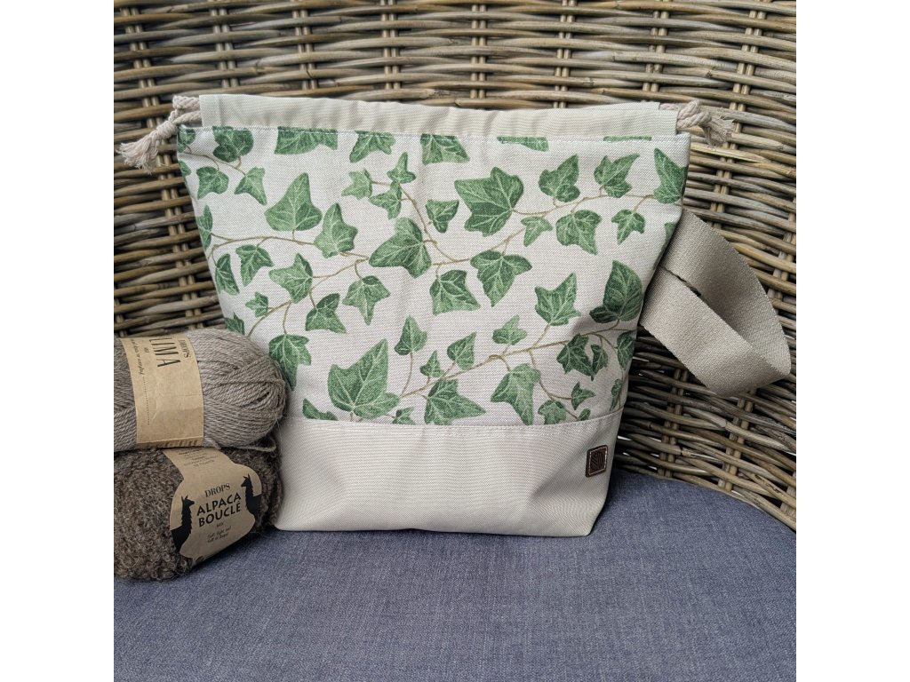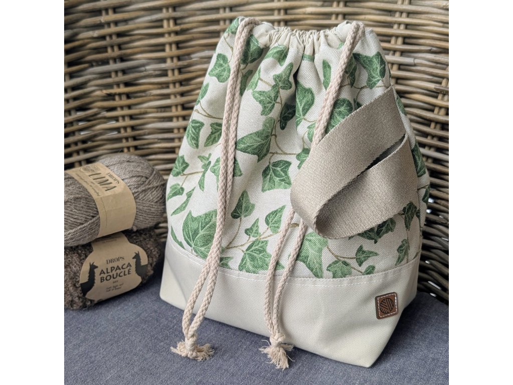 Spodek tašky je ušitý z pevné, omyvatelné kočárkoviny, takže snese cestování, pokládání na zem nebo používání venku. Tašku pohodlně stáhnete bavlněnou šňůrkou, a když se chystáte pletení vzít s sebou, oceníte široký popruh na zápěstí, díky kterému se taška dobře nosí, aniž by překážela.