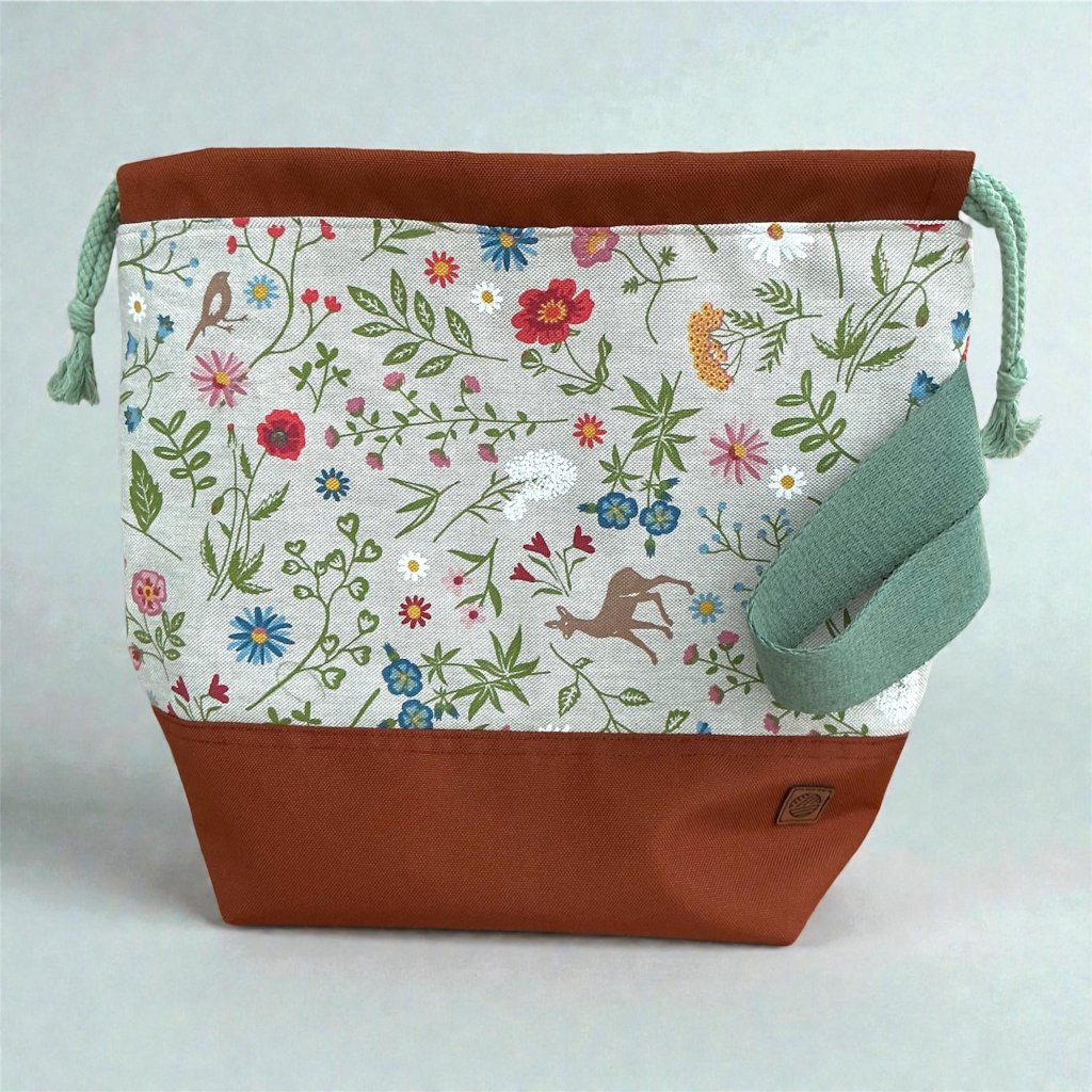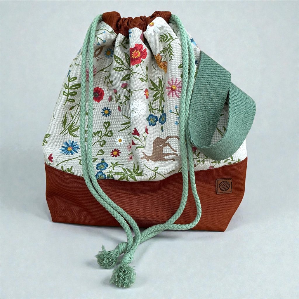Ručně šitá projektová taška Klubkovka, vyrobená v malebném kraji Podhostýnska s bavlněnou podšívkou, dvěma kapsami, poutkem na značkovače, širokým popruhem na zápěstí a odolným dnem z omyvatelné kočárkoviny. Stahování bavlněnou šňůrkou — ideální na cesty i domácí pletení.