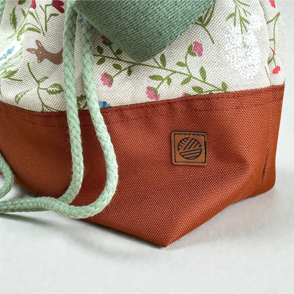 Spodek tašky je ušitý z pevné, omyvatelné kočárkoviny, takže snese cestování, pokládání na zem nebo používání venku. Tašku pohodlně stáhnete bavlněnou šňůrkou, a když se chystáte pletení vzít s sebou, oceníte široký popruh na zápěstí, díky kterému se taška dobře nosí, aniž by překážela.