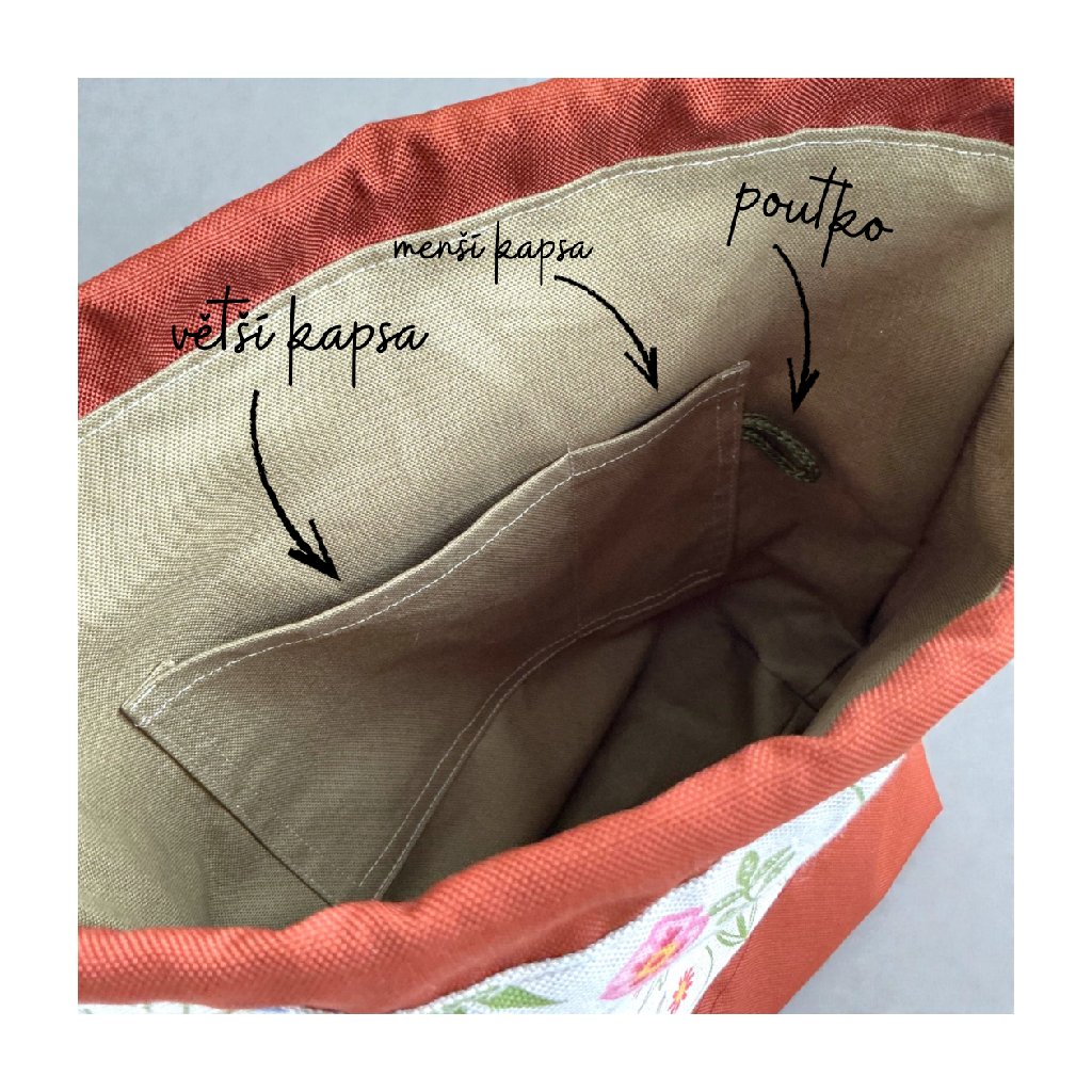 Taška vznikla pomalu a poctivě — v malé šicí dílně na Podhostýnsku. Vnější látka (80 % bavlna, 20 % polyester) dává tašce příjemný vzhled i odolnost, bavlněná podšívka uvnitř chrání vaše klubíčka a práci před zatržením. Uvnitř najdete dvě šikovné kapsy: jednu větší napriklad na návod, nůžky nebo přízi a druhou úzkou, přesně na jehlice, háčky či drobnosti.