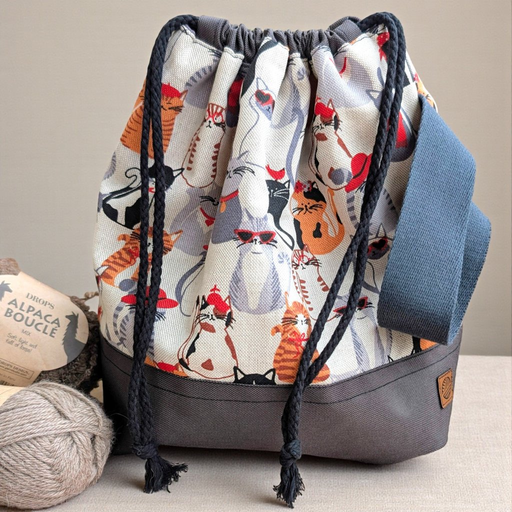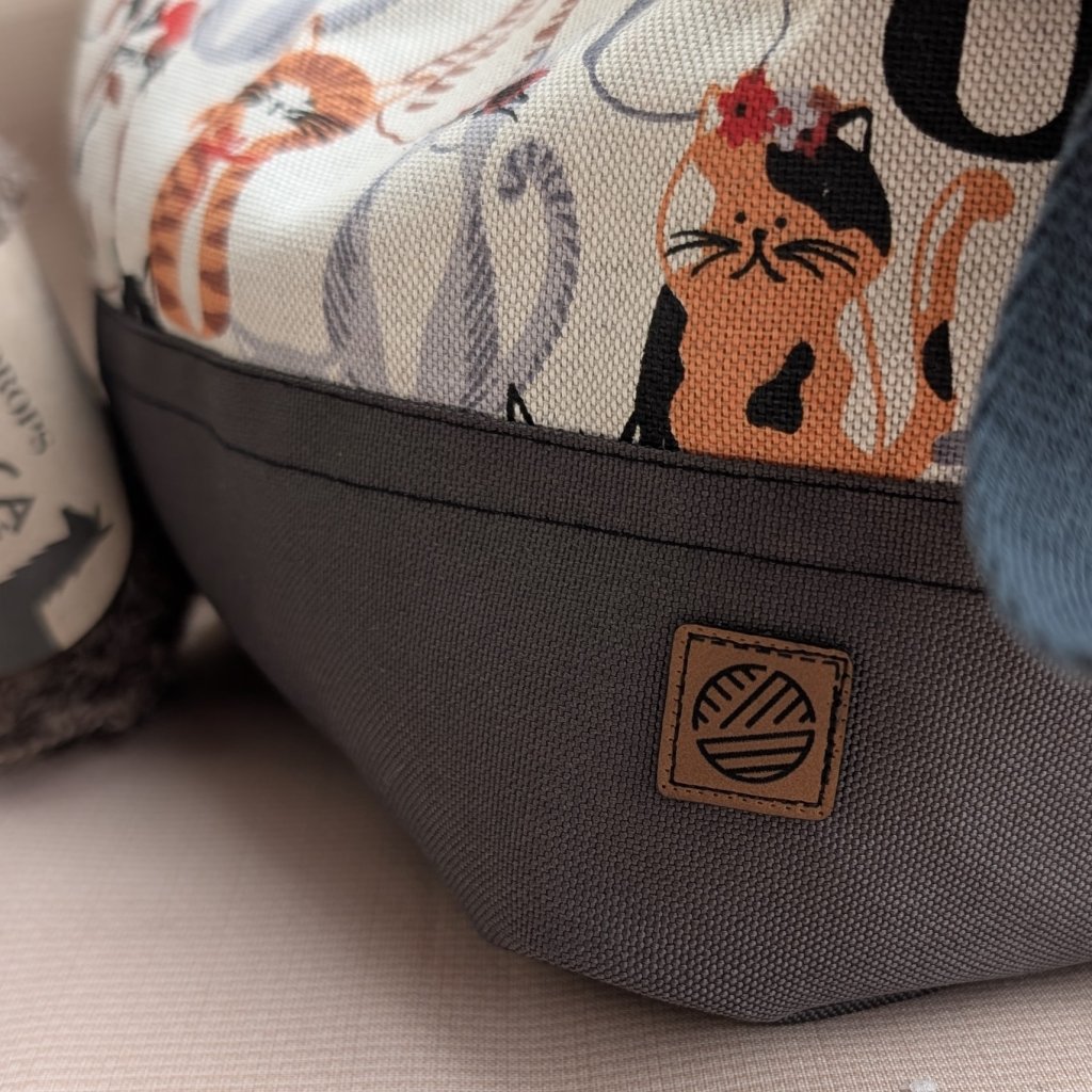 Spodek tašky je ušitý z pevné, omyvatelné kočárkoviny, takže snese cestování, pokládání na zem nebo používání venku. Tašku pohodlně stáhnete bavlněnou šňůrkou, a když se chystáte pletení vzít s sebou, oceníte široký popruh na zápěstí, díky kterému se taška dobře nosí, aniž by překážela.