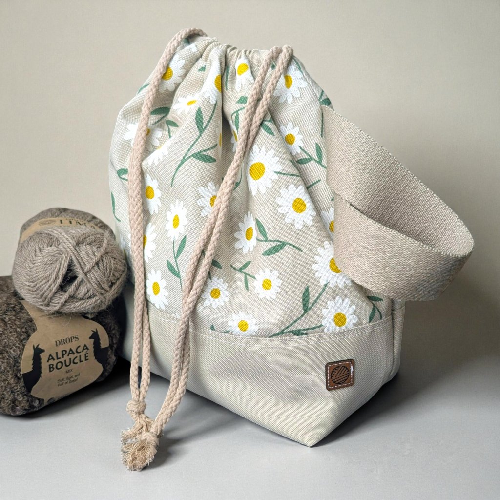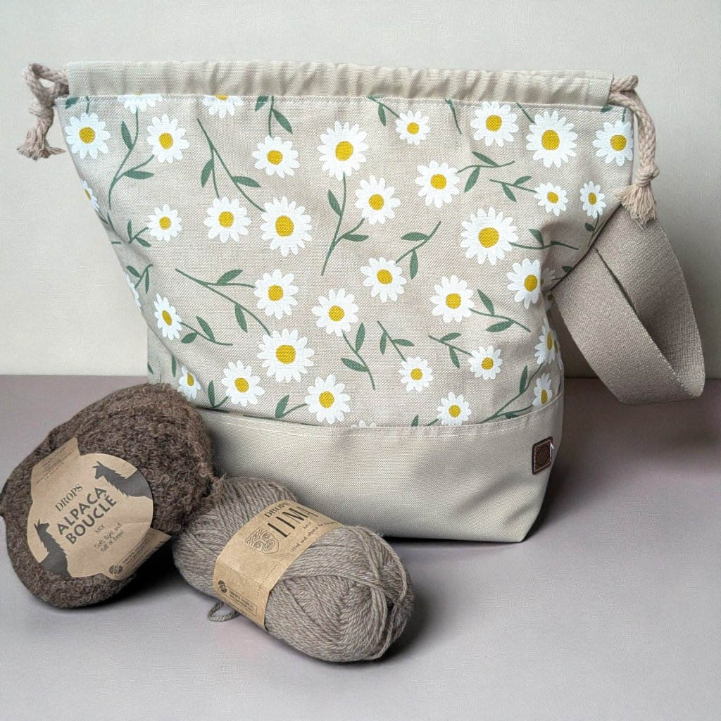 Spodek tašky je ušitý z pevné, omyvatelné kočárkoviny, takže snese cestování, pokládání na zem nebo používání venku. Tašku pohodlně stáhnete bavlněnou šňůrkou, a když se chystáte pletení vzít s sebou, oceníte široký popruh na zápěstí, díky kterému se taška dobře nosí, aniž by překážela.