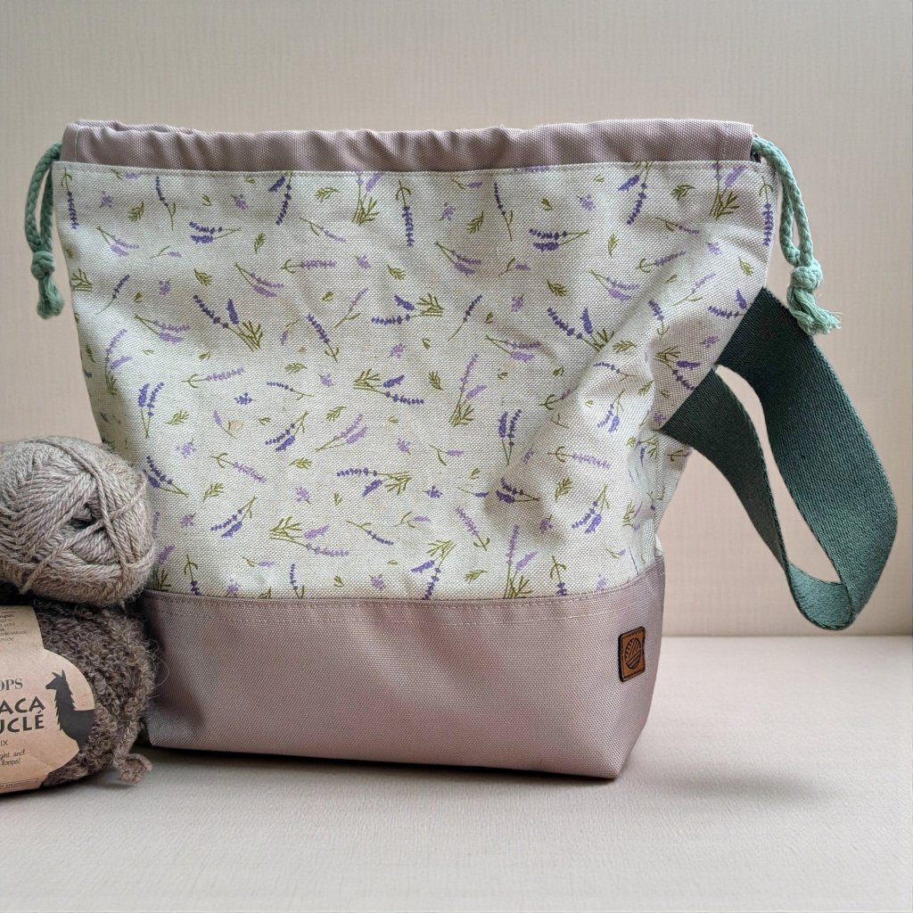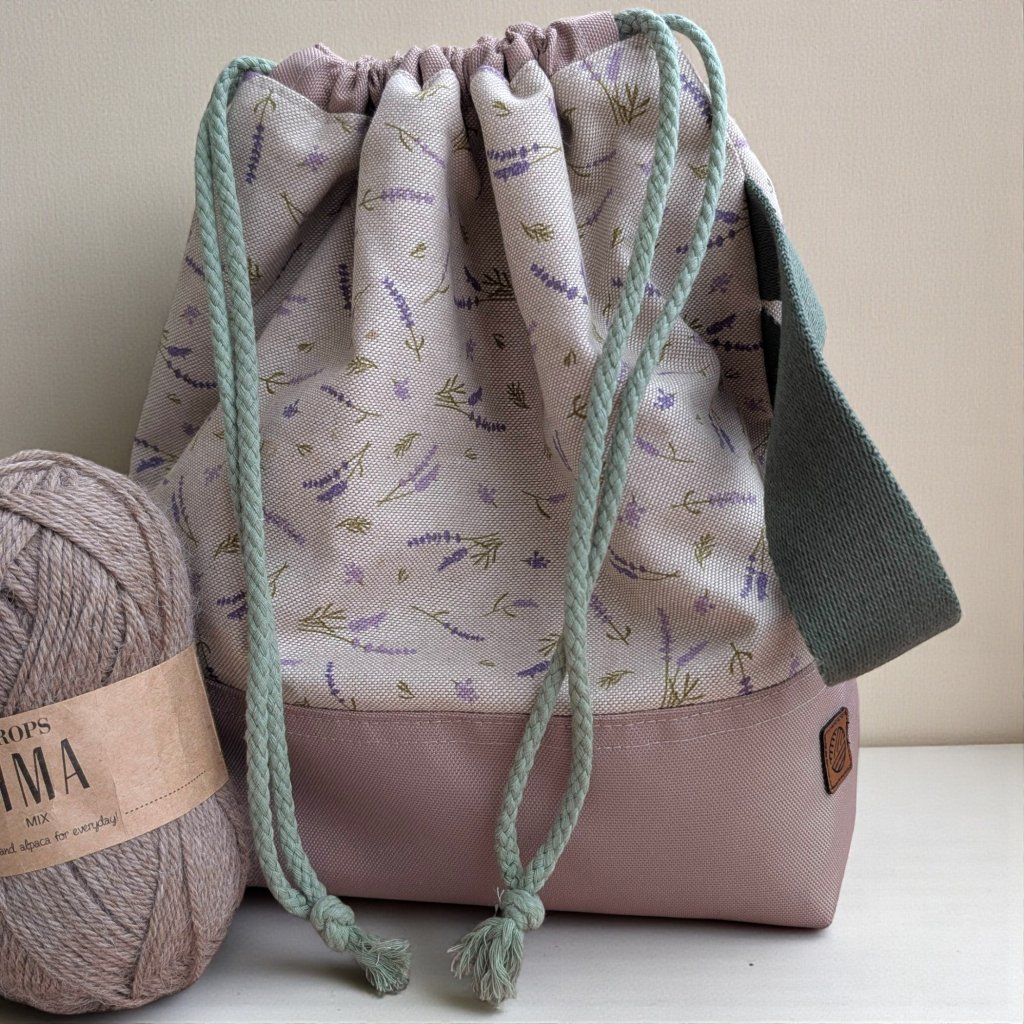 Spodek tašky je ušitý z pevné, omyvatelné kočárkoviny, takže snese cestování, pokládání na zem nebo používání venku. Tašku pohodlně stáhnete bavlněnou šňůrkou, a když se chystáte pletení vzít s sebou, oceníte široký popruh na zápěstí, díky kterému se taška dobře nosí, aniž by překážela.