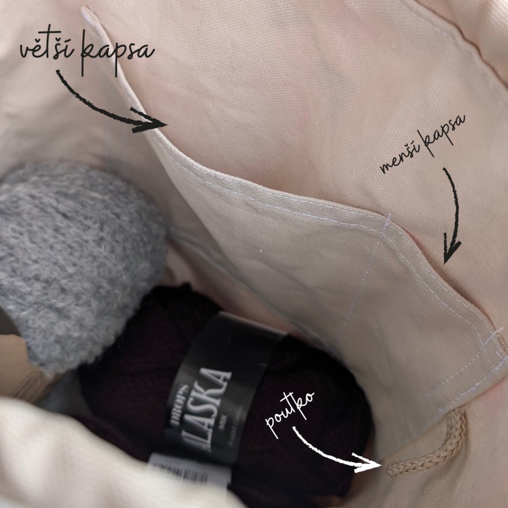 Ručně šitá projektová taška Klubkovka, vyrobená v malebném kraji Podhostýnska s bavlněnou podšívkou, dvěma kapsami, poutkem na značkovače, širokým popruhem na zápěstí a odolným dnem z omyvatelné kočárkoviny. Stahování bavlněnou šňůrkou — ideální na cesty i domácí pletení.