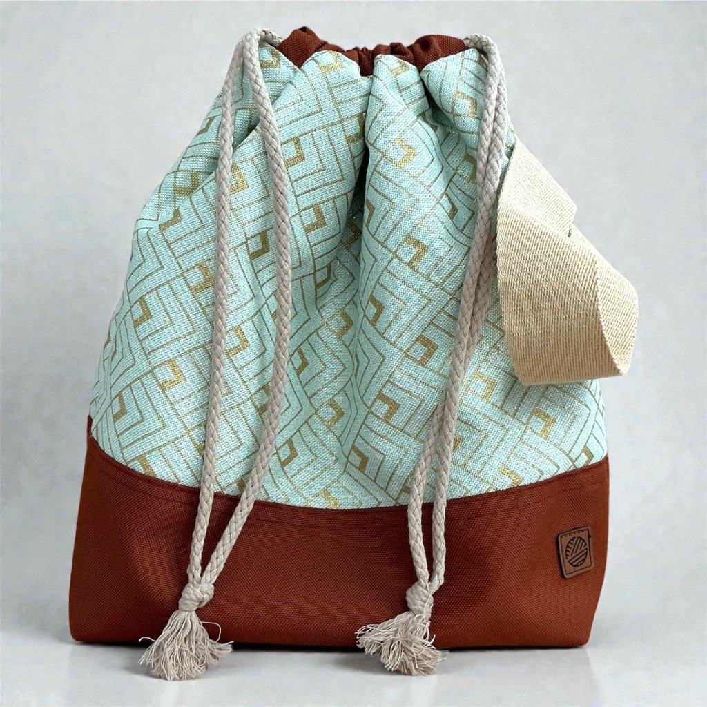 Ručně šitá projektová taška Klubkovka, vyrobená v malebném kraji Podhostýnska s bavlněnou podšívkou, dvěma kapsami, poutkem na značkovače, širokým popruhem na zápěstí a odolným dnem z omyvatelné kočárkoviny. Stahování bavlněnou šňůrkou — ideální na cesty i domácí pletení.
