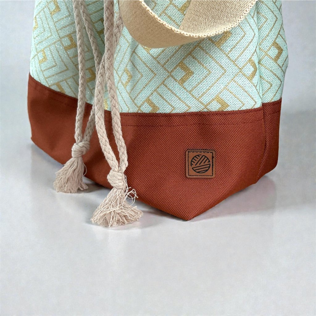 Spodek tašky je ušitý z pevné, omyvatelné kočárkoviny, takže snese cestování, pokládání na zem nebo používání venku. Tašku pohodlně stáhnete bavlněnou šňůrkou, a když se chystáte pletení vzít s sebou, oceníte široký popruh na zápěstí, díky kterému se taška dobře nosí, aniž by překážela.