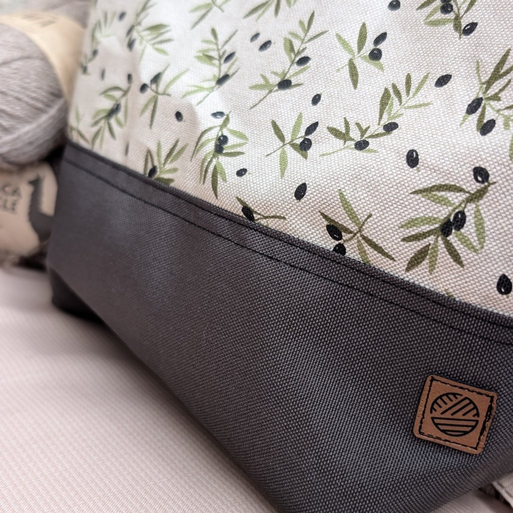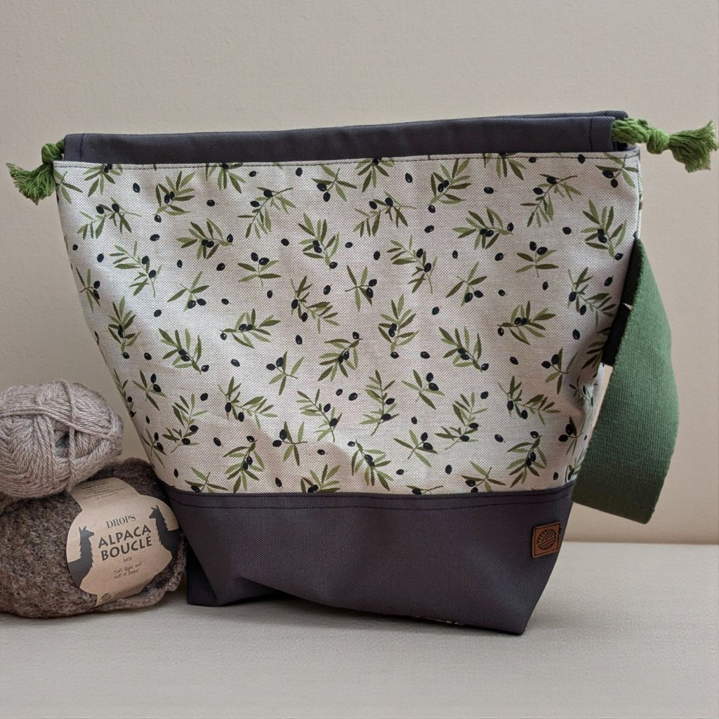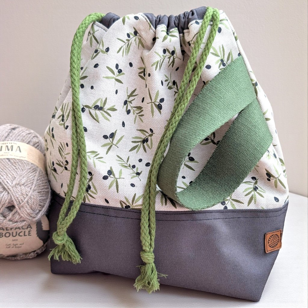 Spodek tašky je ušitý z pevné, omyvatelné kočárkoviny, takže snese cestování, pokládání na zem nebo používání venku. Tašku pohodlně stáhnete bavlněnou šňůrkou, a když se chystáte pletení vzít s sebou, oceníte široký popruh na zápěstí, díky kterému se taška dobře nosí, aniž by překážela.