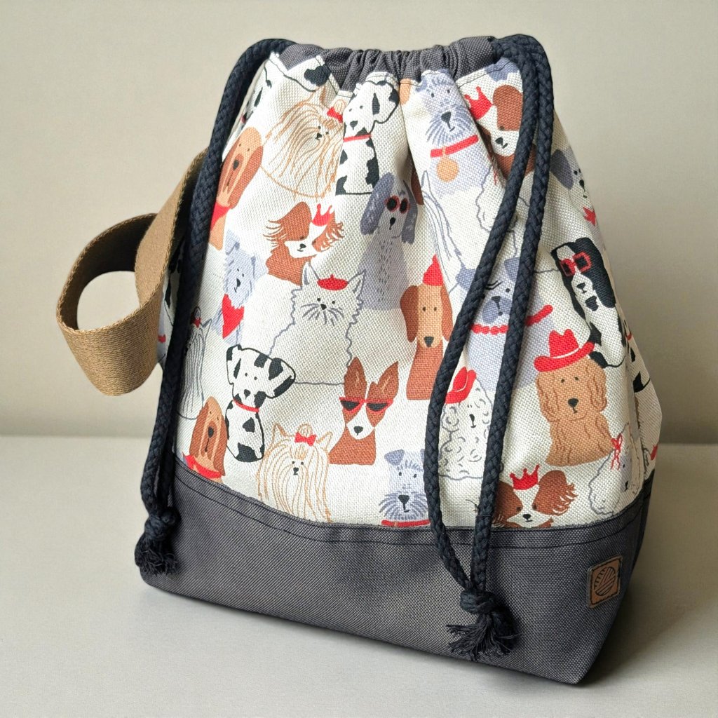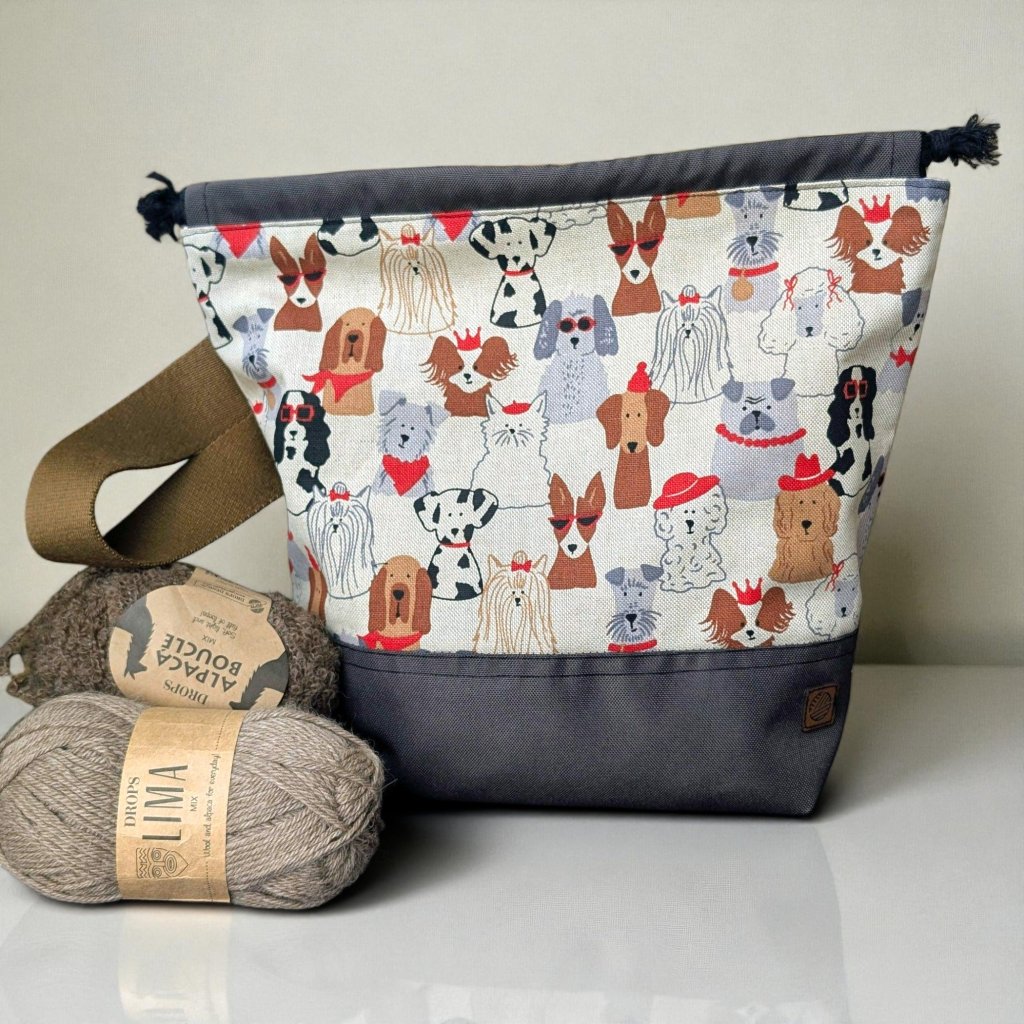 Spodek tašky je ušitý z pevné, omyvatelné kočárkoviny, takže snese cestování, pokládání na zem nebo používání venku. Tašku pohodlně stáhnete bavlněnou šňůrkou, a když se chystáte pletení vzít s sebou, oceníte široký popruh na zápěstí, díky kterému se taška dobře nosí, aniž by překážela.