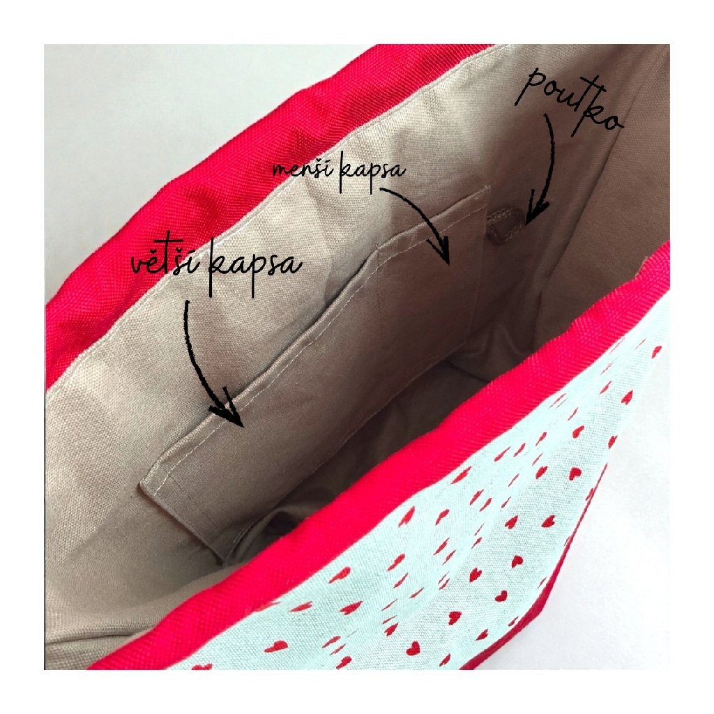 Taška vznikla pomalu a poctivě — v malé šicí dílně na Podhostýnsku. Vnější látka (80 % bavlna, 20 % polyester) dává tašce příjemný vzhled i odolnost, bavlněná podšívka uvnitř chrání vaše klubíčka a práci před zatržením. Uvnitř najdete dvě šikovné kapsy: jednu větší napriklad na návod, nůžky nebo přízi a druhou úzkou, přesně na jehlice, háčky či drobnosti.