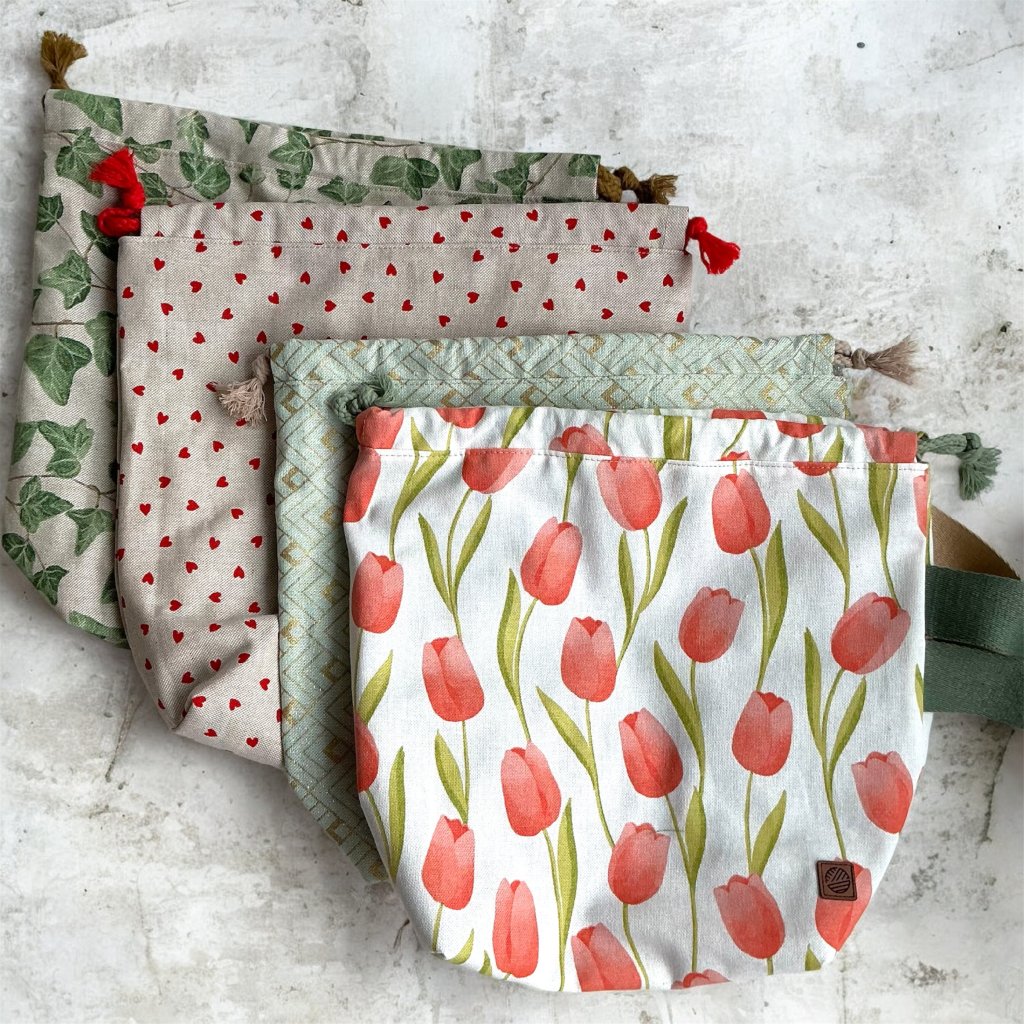 Ručně šitá projektová taška Klubkovka, vyrobená v malebném kraji Podhostýnska s bavlněnou podšívkou, dvěma kapsami, poutkem a širokým popruhem na zápěstí. Narozdíl od klasické Klubkovky nemá omyvatelné dno. Stahování bavlněnou šňůrkou — ideální na cesty i domácí pletení.