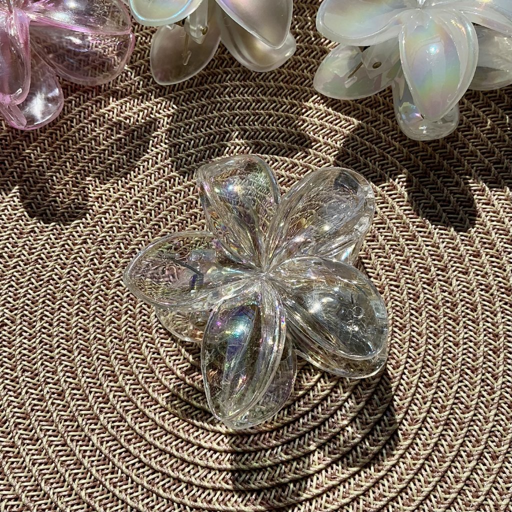 Přeneste se na slunné pláže Havaje s tímto nádherným skřipcem ve tvaru plumerie – symbolu něhy, klidu a tropické krásy. Díky svému jemnému květinovému tvaru a duhovému povrchu se hodí pro každodenní nošení i jako doplněk k letním outfitům.